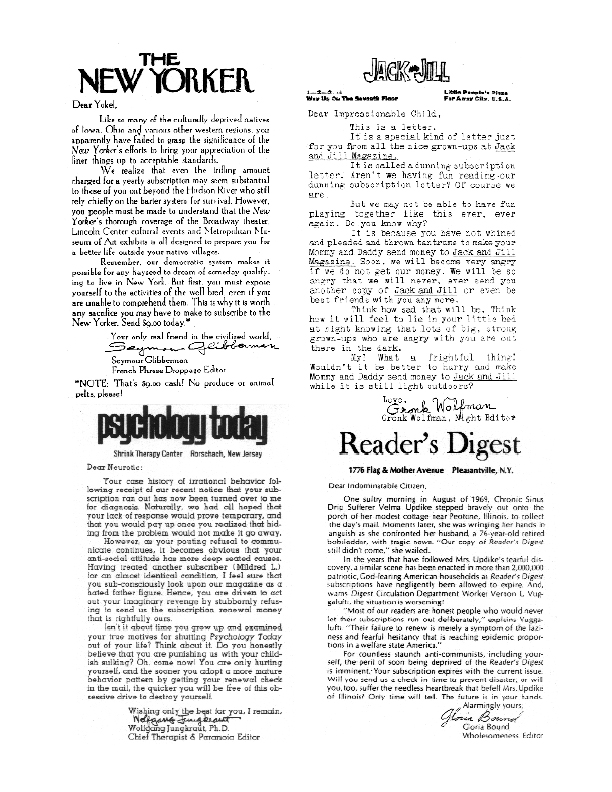 Write one, two, or three subscription-renewal letters (the total word count of the project is to be at least 200). Carefully tailor the leters to appeal to the readers of the magazines you are supposedly representing. Here are some samples from the pages of Mad Magazine (reprinted with permission of the publisher). You may approach this project satirically or soberly. All of my examples below are satirical.